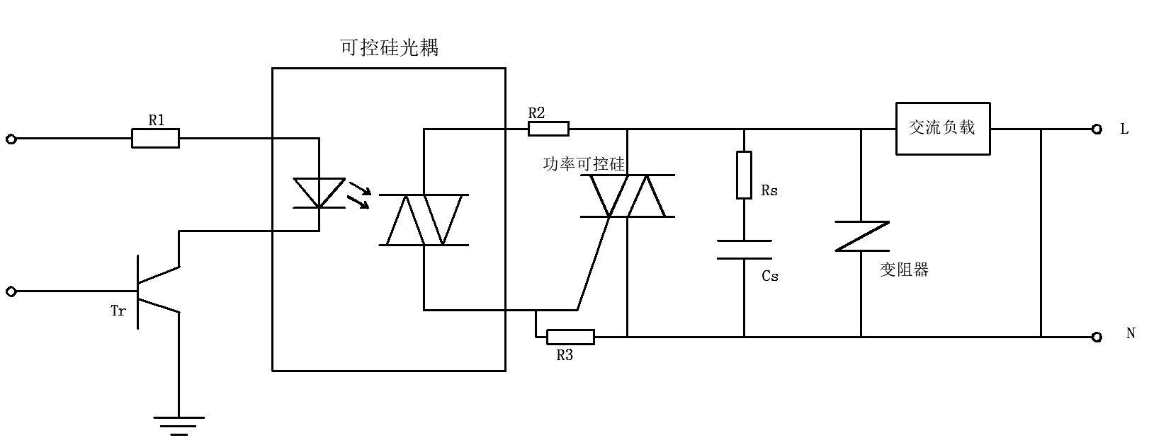 Thyristor photocouplers can be isolated for AC load control, provided the load is relatively small (about 50 mA or less). For larger currents (up to a few amps), a SCR photocoupler is combined with a high-power SCR for AC load control. The following diagram shows the basic circuit configuration. Rs and Cs are elements of the buffer circuit that prevent the thyristor photocoupler switch failure by shielding noise, while the varistor absorbs any surge voltage from the power line.